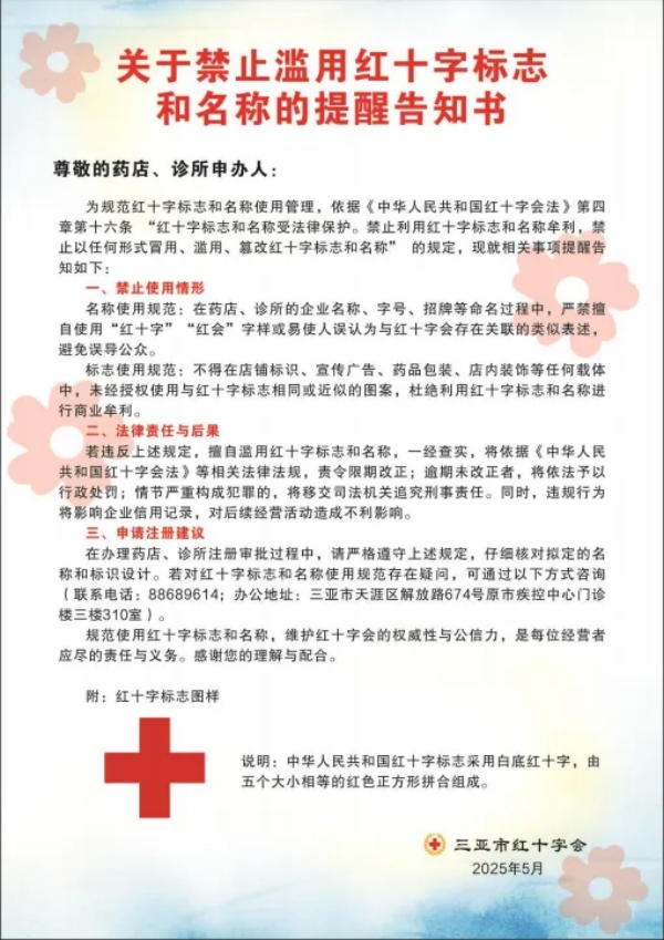 一是针对全市个别药店、诊所等机构可能存在的滥用红十字标志(名称)行为,展开清理规范。6月初,三亚市红十字会积极部署,组织专人对市城区主要街道的药店、诊所等商户的招牌展开全面排查,共发现9家商户存在违规使用红十字标志的情况。针对这一情况,市红十字会第一时间形成问题清单,主动联合市市场监督管理局和市卫健委,向9家商户发送告知书,清晰传达整改要求与规范标准,引导商户自觉纠正违规行为。经联合宣传和监督,截至目前,9家商户已全部完成整改。