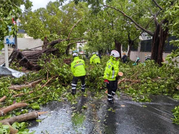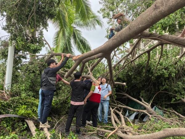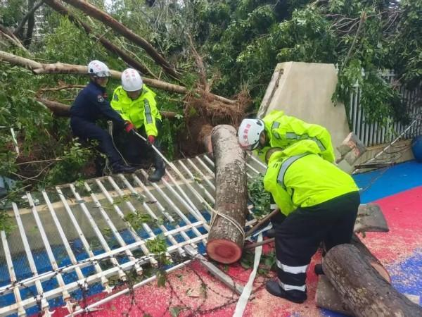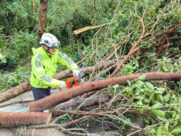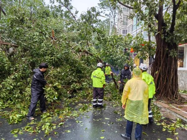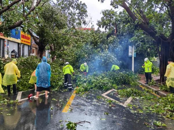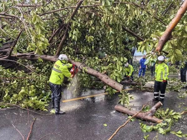 同时,救援队另一党员突击队来到下洋田社区鹿岭路,连续作业6小时,对陡坡上倒伏的树木进行清理,大大方便了来往群众的出行。