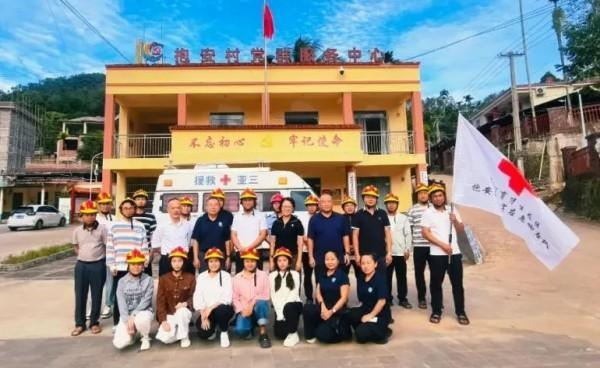 ▲图为三亚市红十字会常务副会长张华菊为抱安村红十字应急响应队授旗并合影