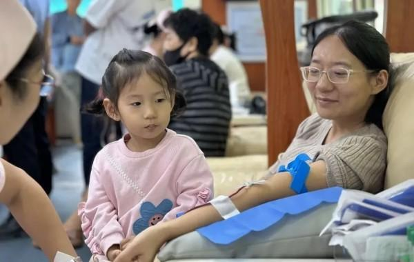 梅山卫生院副院长卢庆带着女儿走上献血车。采血时,女儿静静守在旁,亲眼见证妈妈挽袖献热血的瞬间。这份特殊的“爱心陪伴”,既让孩子感受奉献的意义,也让卢庆的医者担当与母爱交融,成为现场动人一幕。
