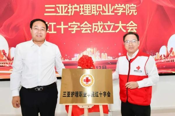 在全体与会人员的共同见证下,梁誉腾与张海俊共同为“三亚护理职业学院红十字会”揭牌。