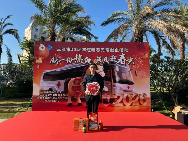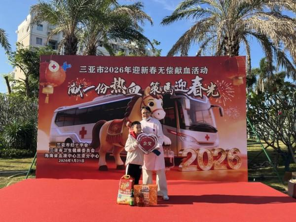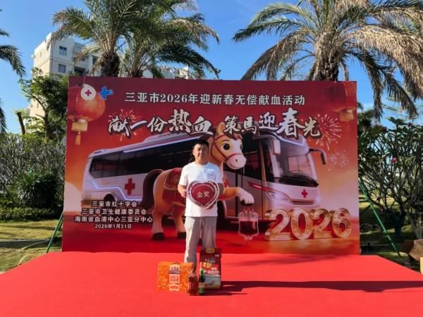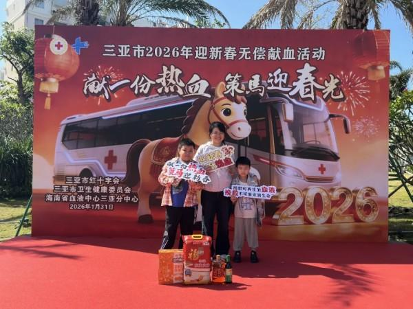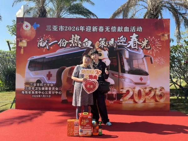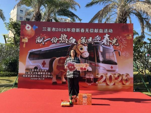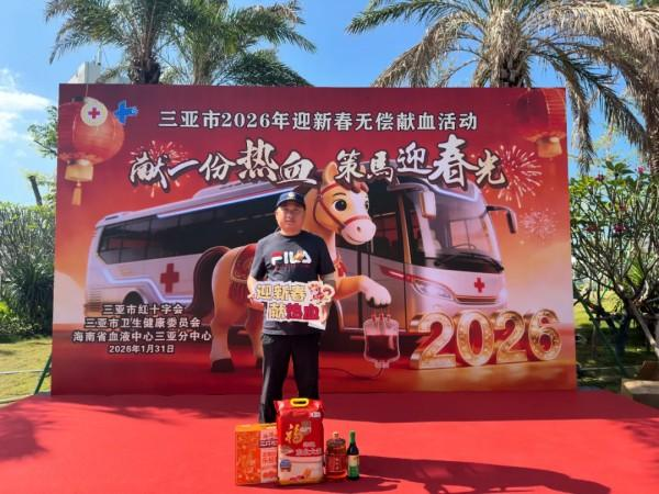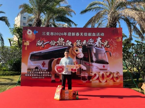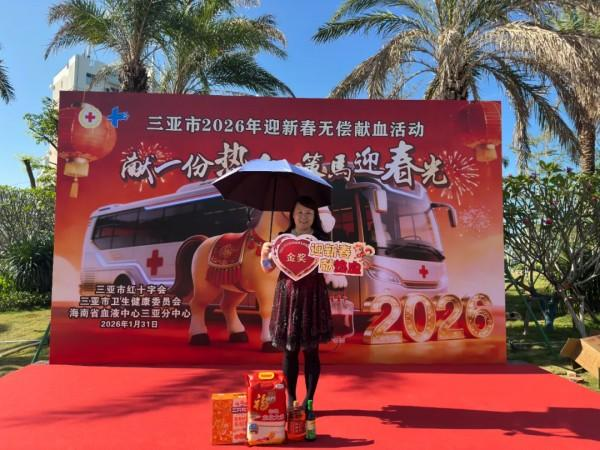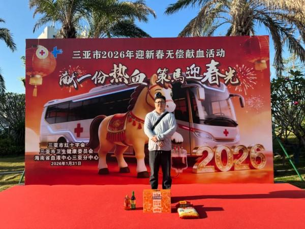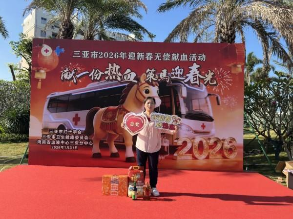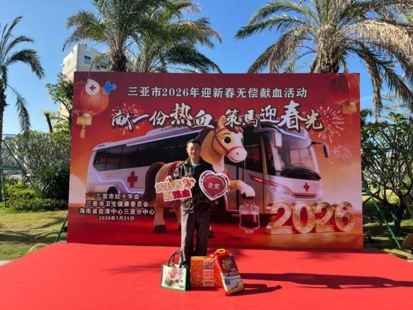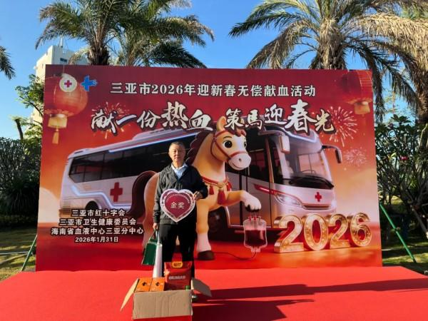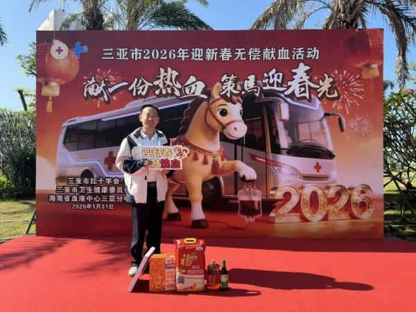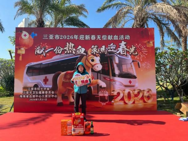 2026年1月31日上午,在三亚湾壹号商场门前广场,三亚市红十字会、三亚市卫生健康委员会、海南省血液中心三亚分中心联合开展“迎新春献热血”无偿献血活动。活动以“献一份热血策马迎春光”为主题,旨在表彰2022—2023年度全国无偿献血奉献奖金奖及终身荣誉奖获得者,同时动员社会各界积极参与无偿献血,切实保障春节期间临床用血需求。