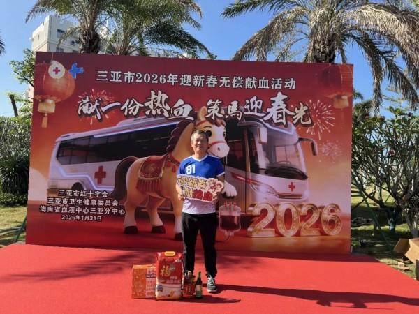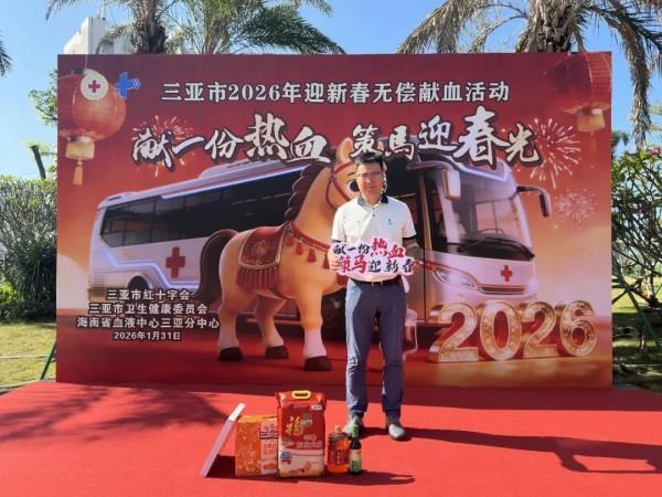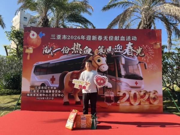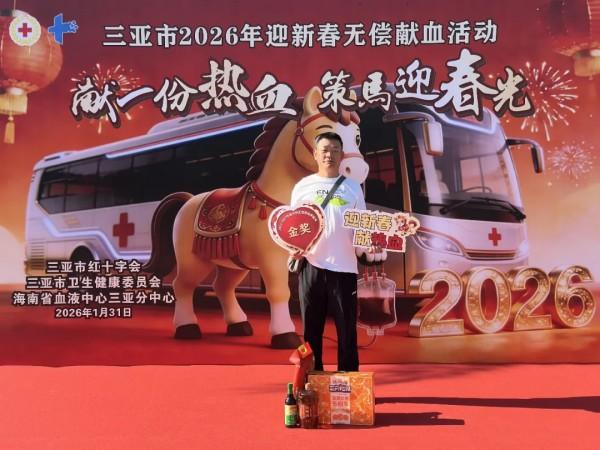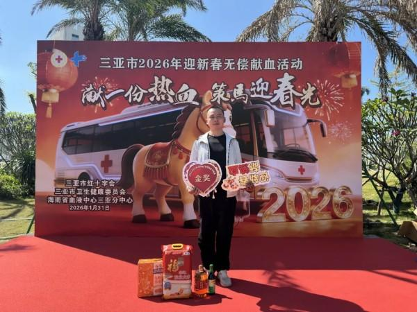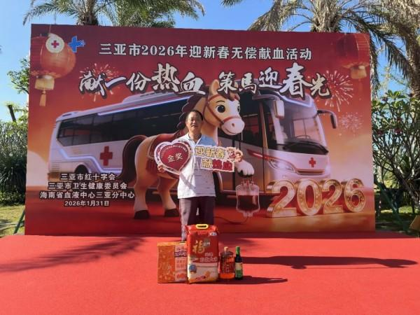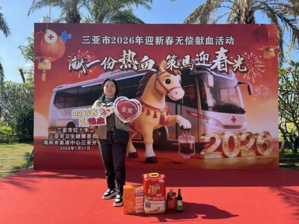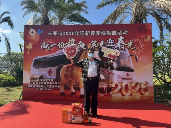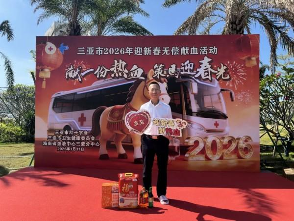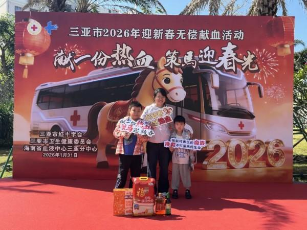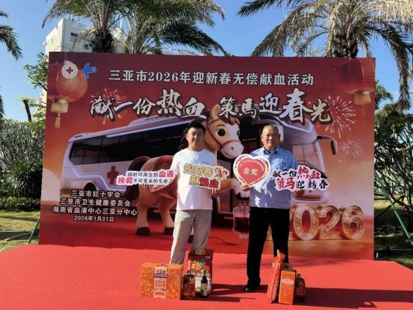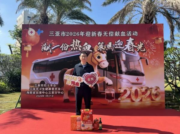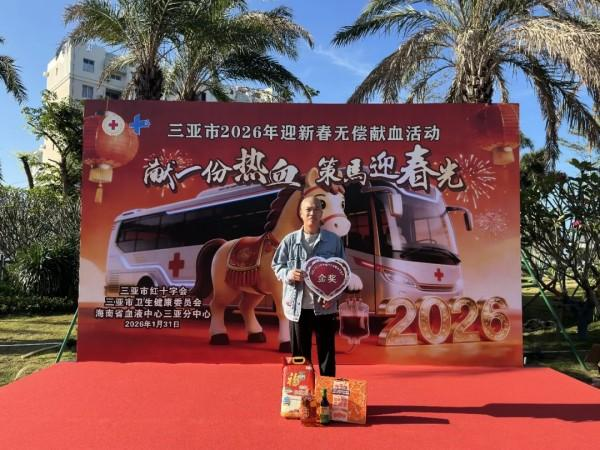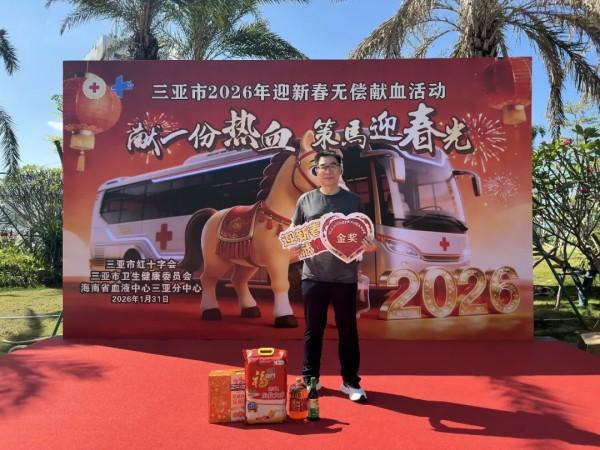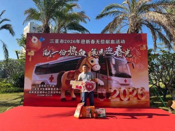2026年1月31日上午,在三亚湾壹号商场门前广场,三亚市红十字会、三亚市卫生健康委员会、海南省血液中心三亚分中心联合开展“迎新春献热血”无偿献血活动。活动以“献一份热血策马迎春光”为主题,旨在表彰2022—2023年度全国无偿献血奉献奖金奖及终身荣誉奖获得者,同时动员社会各界积极参与无偿献血,切实保障春节期间临床用血需求。