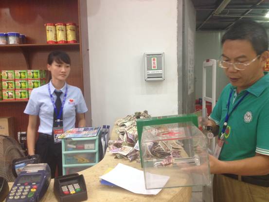 ,在福乐多超市,市红十字会工作人员与超市员工清点募捐箱款,共收取红十字募捐箱款