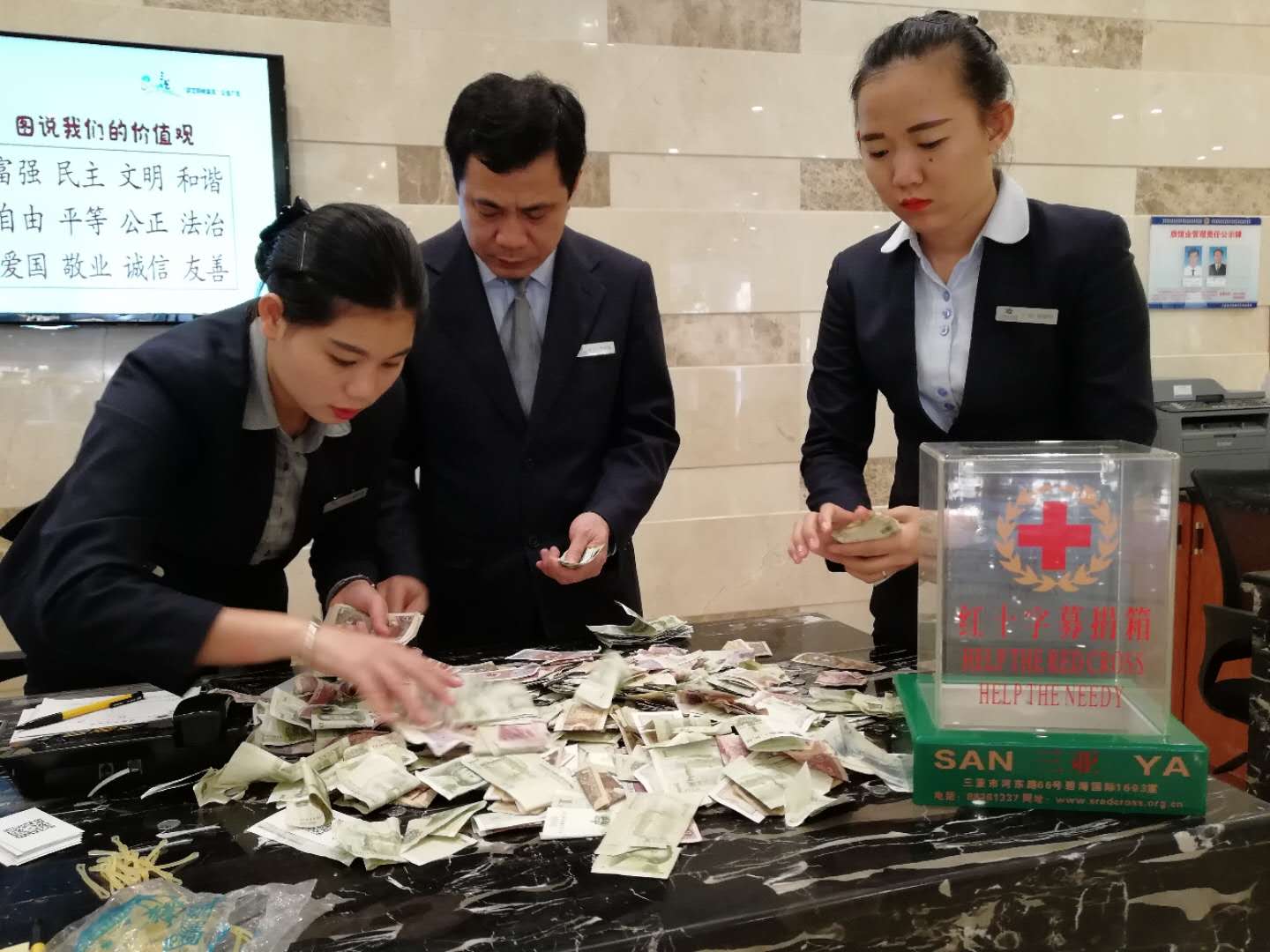 2019年3月29日,在三亚海天大酒店,市红十字会工作人员与酒店工作人员清点募捐箱款,共收取红十字募捐箱款696.6元。经手人:杨亚锋、孙丽华。感谢海天大酒店对红十字公益事业的支持。
