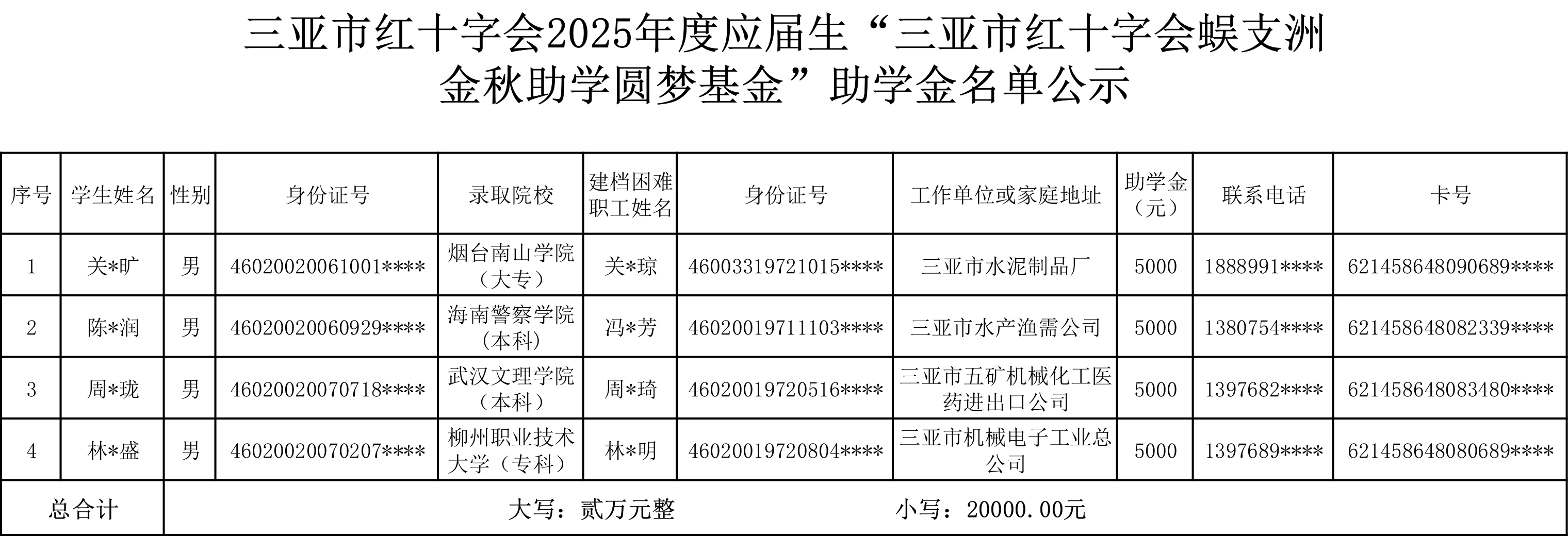 经2025年11月20日下午,三亚市总工会、三亚市红十字会和海南蜈支洲旅游开发股份有限公司三亚蜈支洲岛旅游区三方在市总工会一楼会议室召开的“三亚市红十字会蜈支洲金秋助学圆梦基金”管理委员会2025年度第二次会议讨论决定,给2025年度4名应届生发放金秋助学金,标准为每人5000.00元,共计20000.00元。经市红十字会救助项目审核小组对4名应届生提交的各类证明材料进行审查核实后报市红十字会执委会和党组会议讨论,通过对4名学生材料的审核。