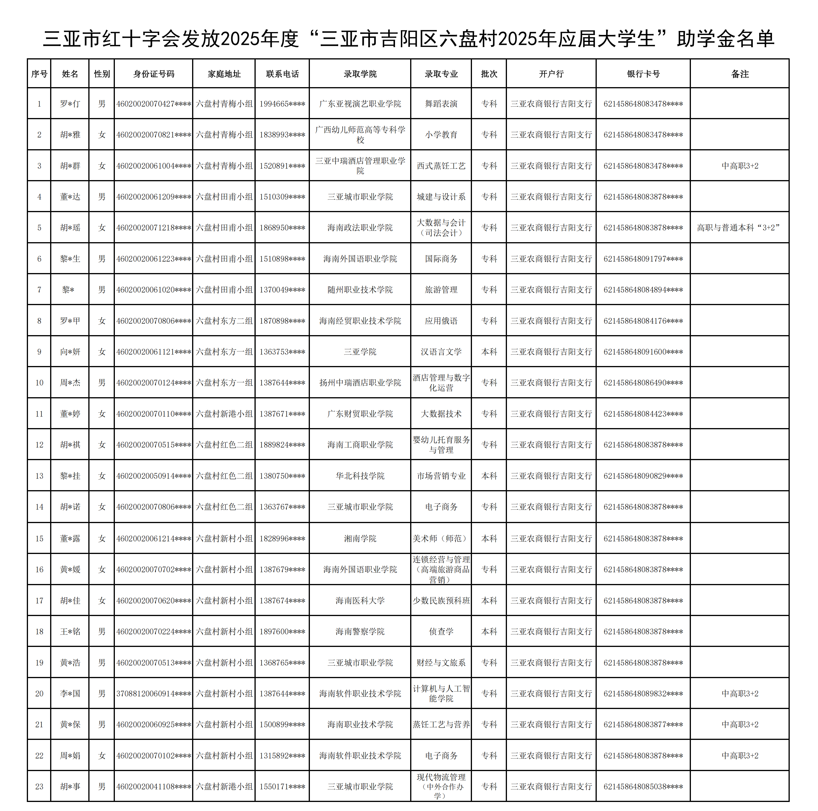 三亚市红十字会发放2025年度“三亚市吉阳区六盘村2025年应届大学生”助学金名单(部分信息因涉及隐私,予以隐去)