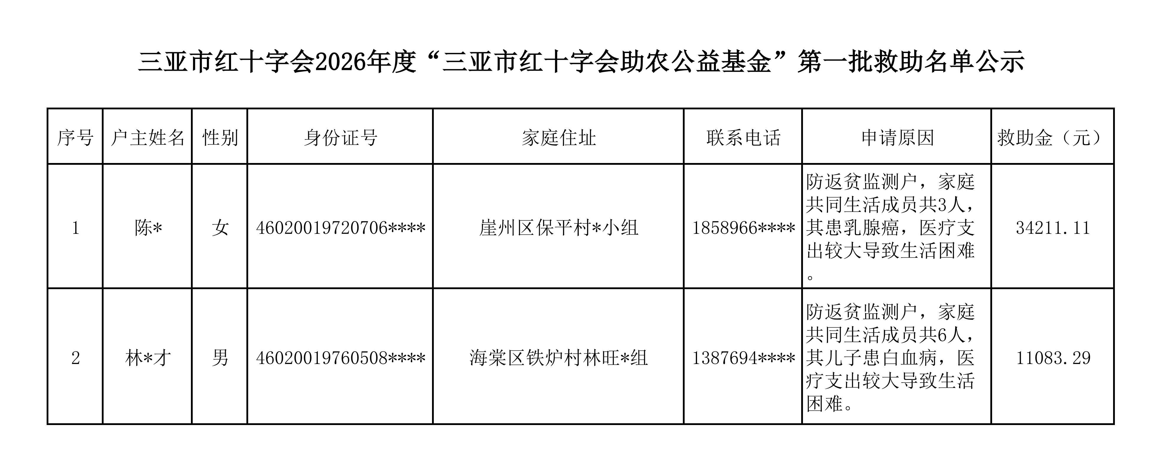 附件:三亚市红十字会2026年度“三亚市红十字会助农公益基金”第一批救助名单公示(部分信息因涉及隐私,予以隐去)